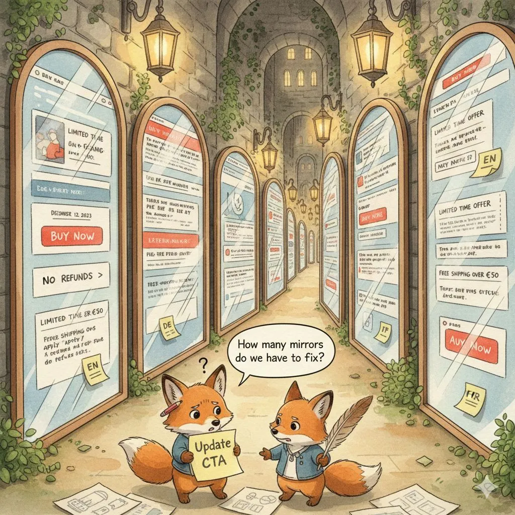 - Updates don’t propagate: EN changes, DE forgets, FR stays in 2023.