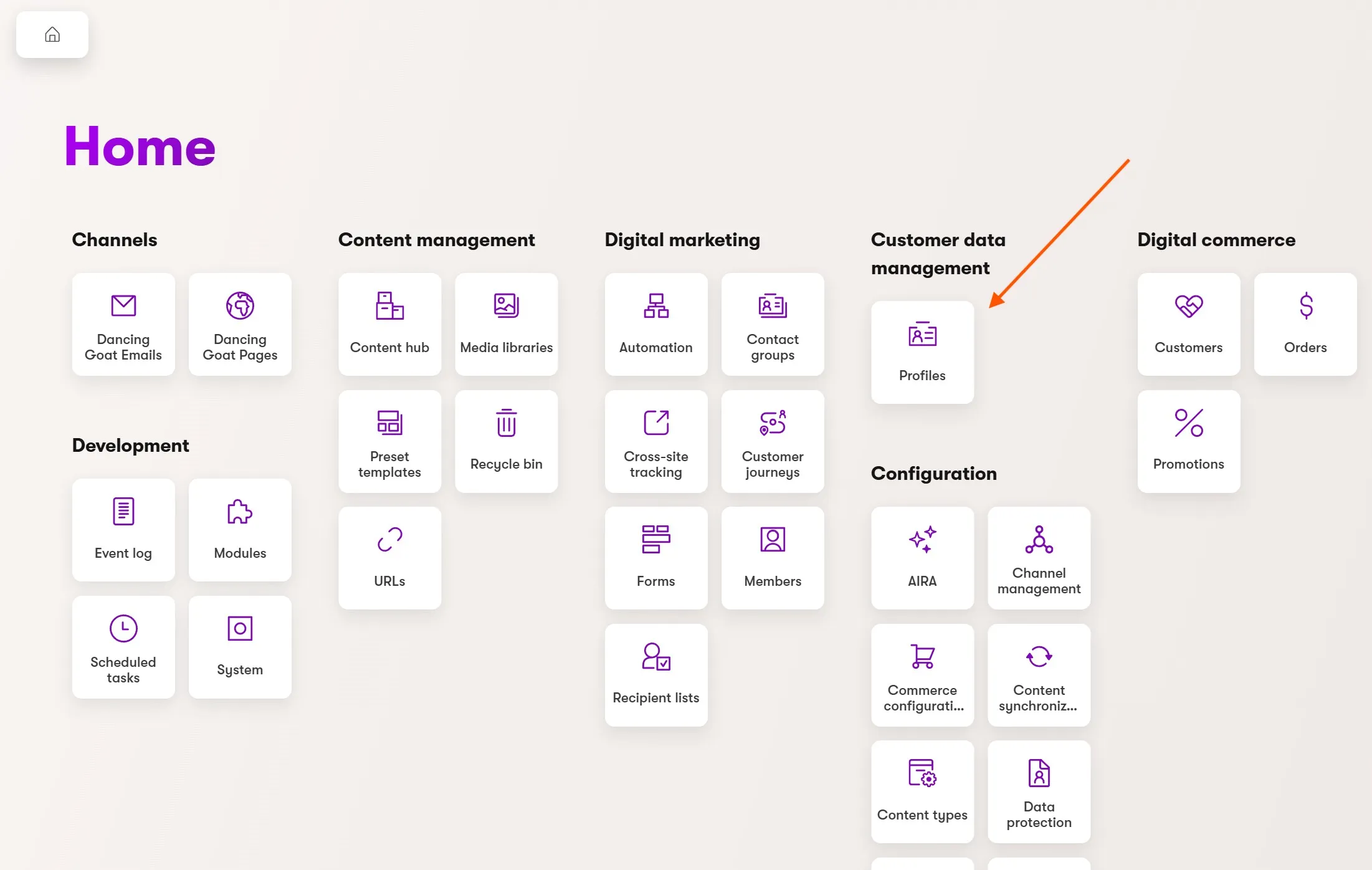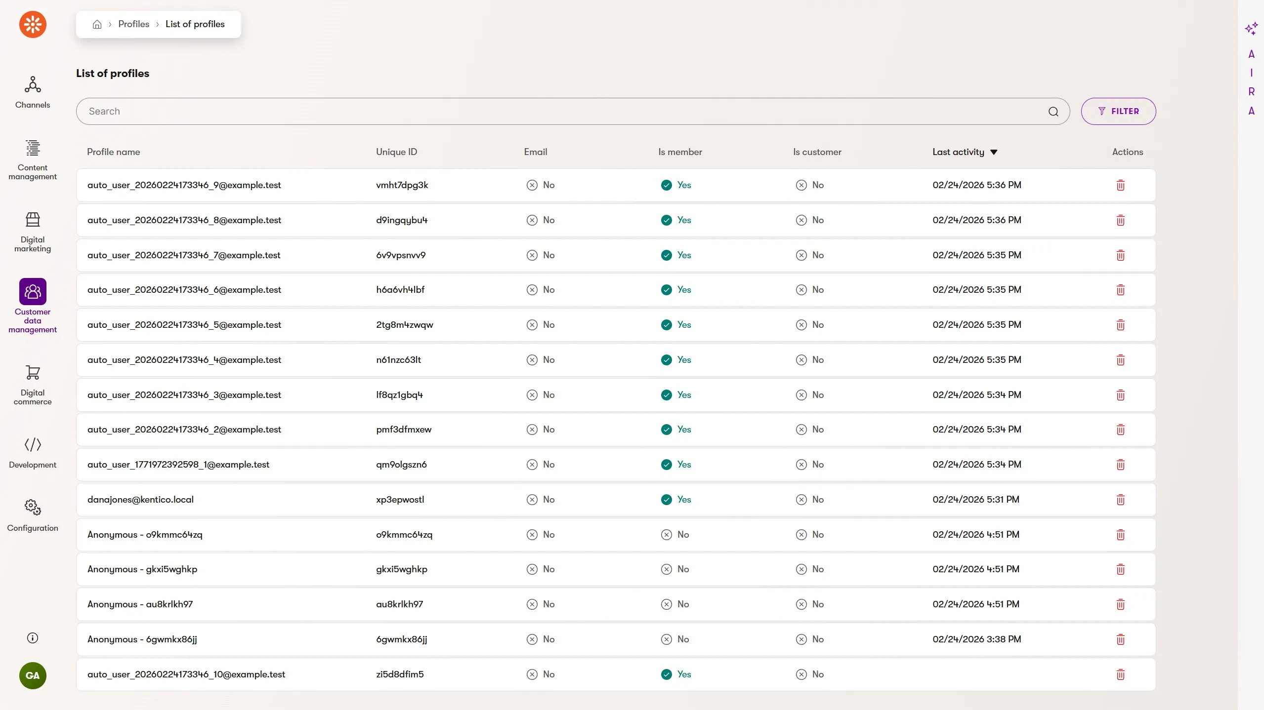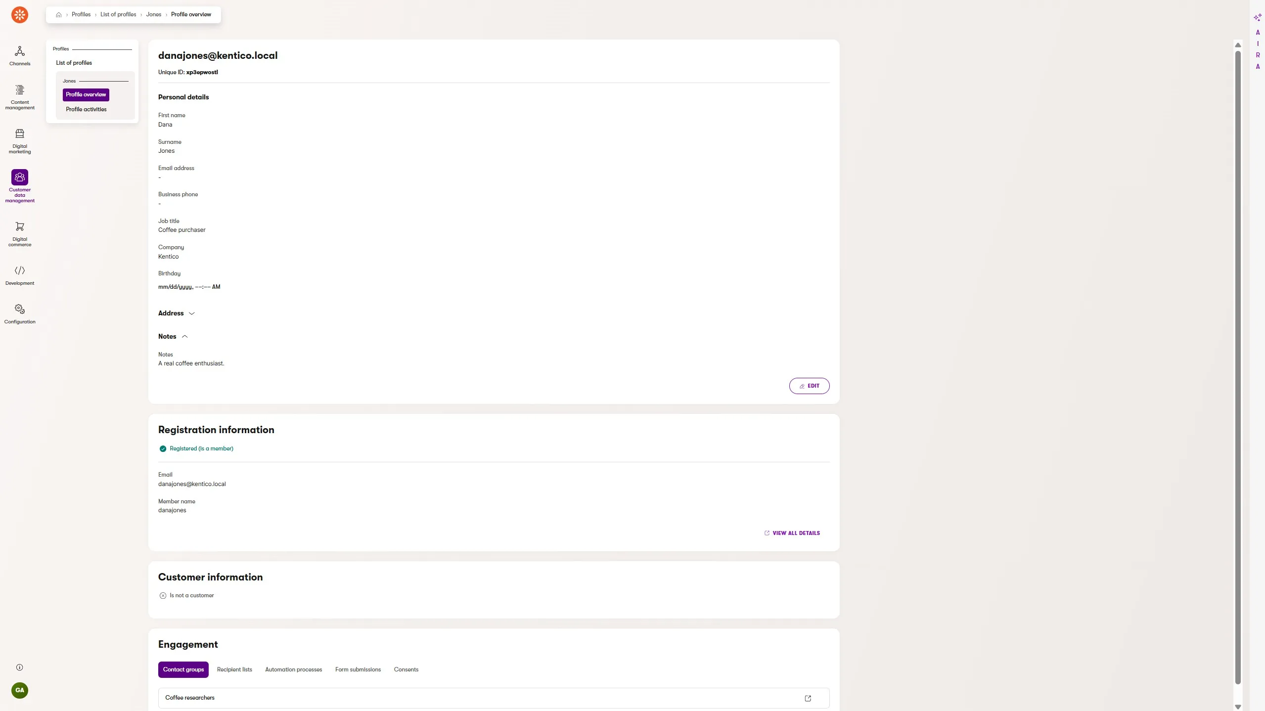 Today, the new profiles application on the Xperience dashboard leads to a listing of profile records.