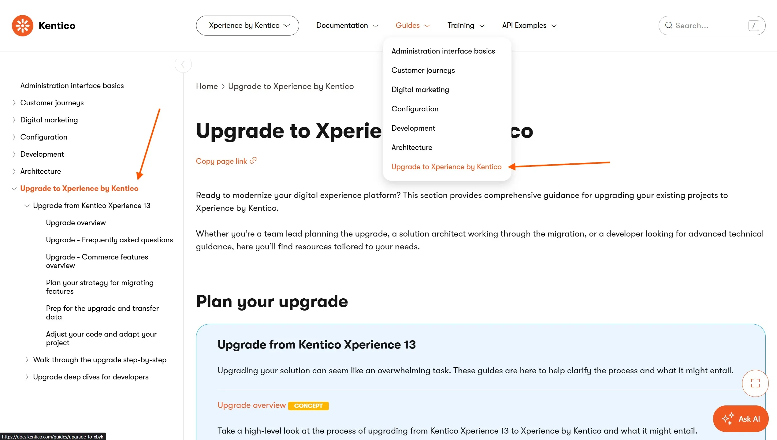 Upgrade to Xperience by Kentico is top level page in our Guides and all upgrade related information can be found underneath it in the side navigation, as shown in the screenshot above.