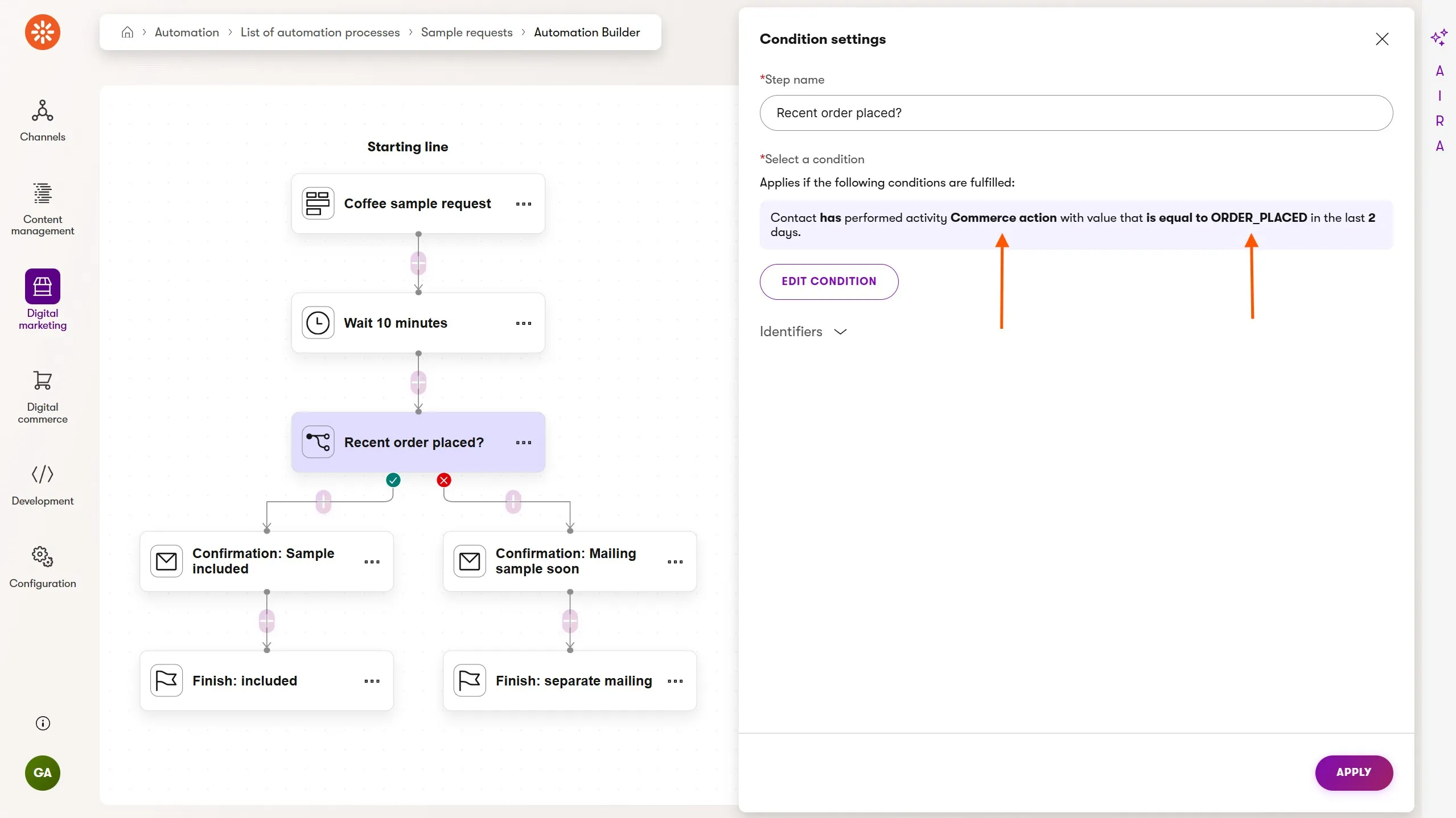 In the screenshot above, a marketer has defined an automation to send a different confirmation email to a customer when they request a coffee sample. When the customer has recently completed an order through a commerce experience the confirmation will let them know the sample is being shipped with their order.