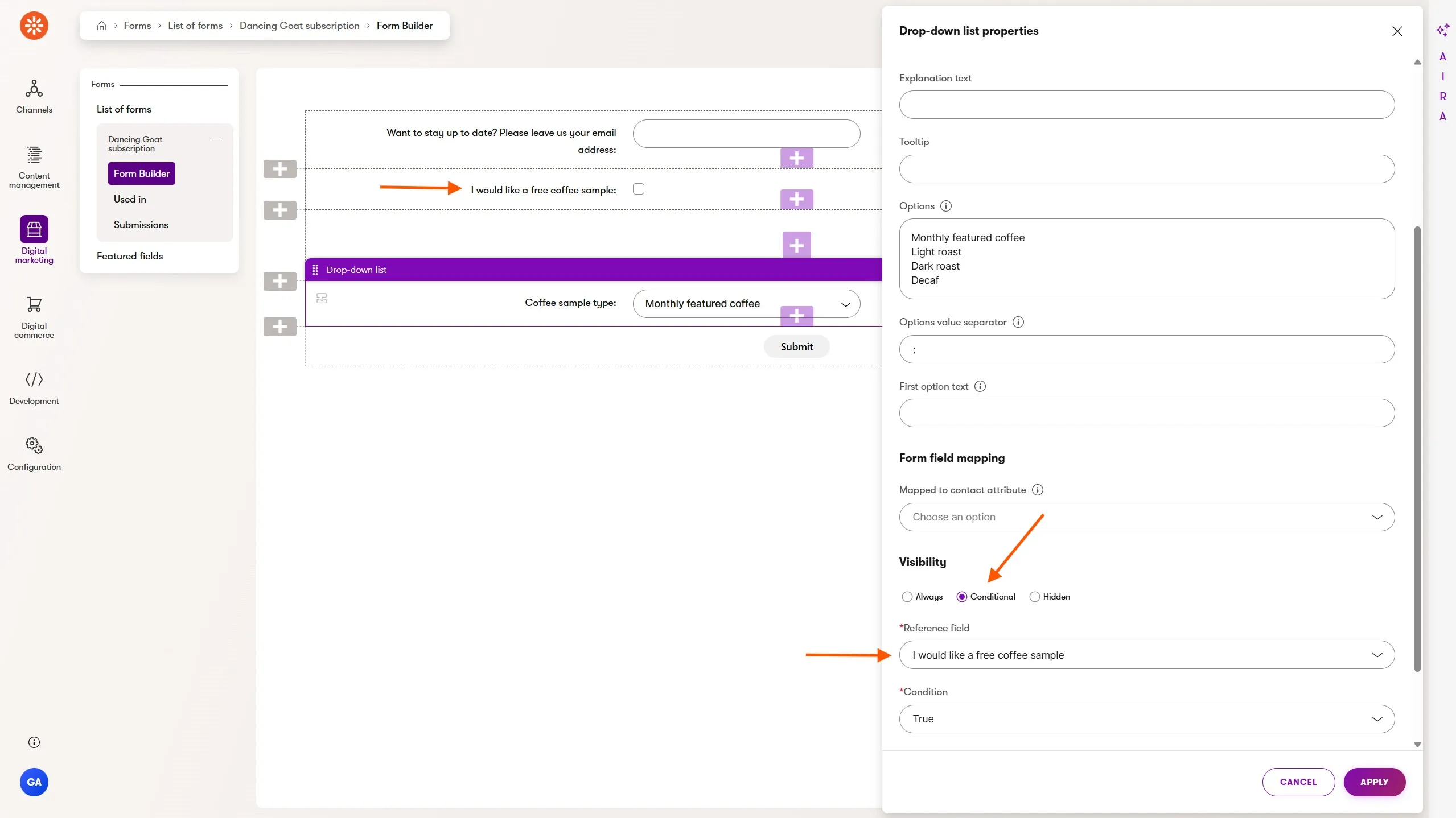 The Coffee sample type field will only be displayed when the I would like a free coffee sample field has a value of true. No web development knowledge is required to set this up - just point, click, and configure!